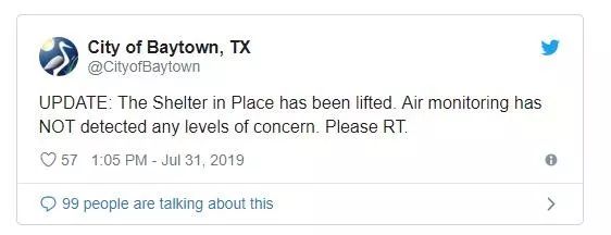 據Baytown市稱,截至下午3:05,為居住在工廠西部和330以南的居民發放的住房已經取消,空氣監測沒有發現任何關注程度。